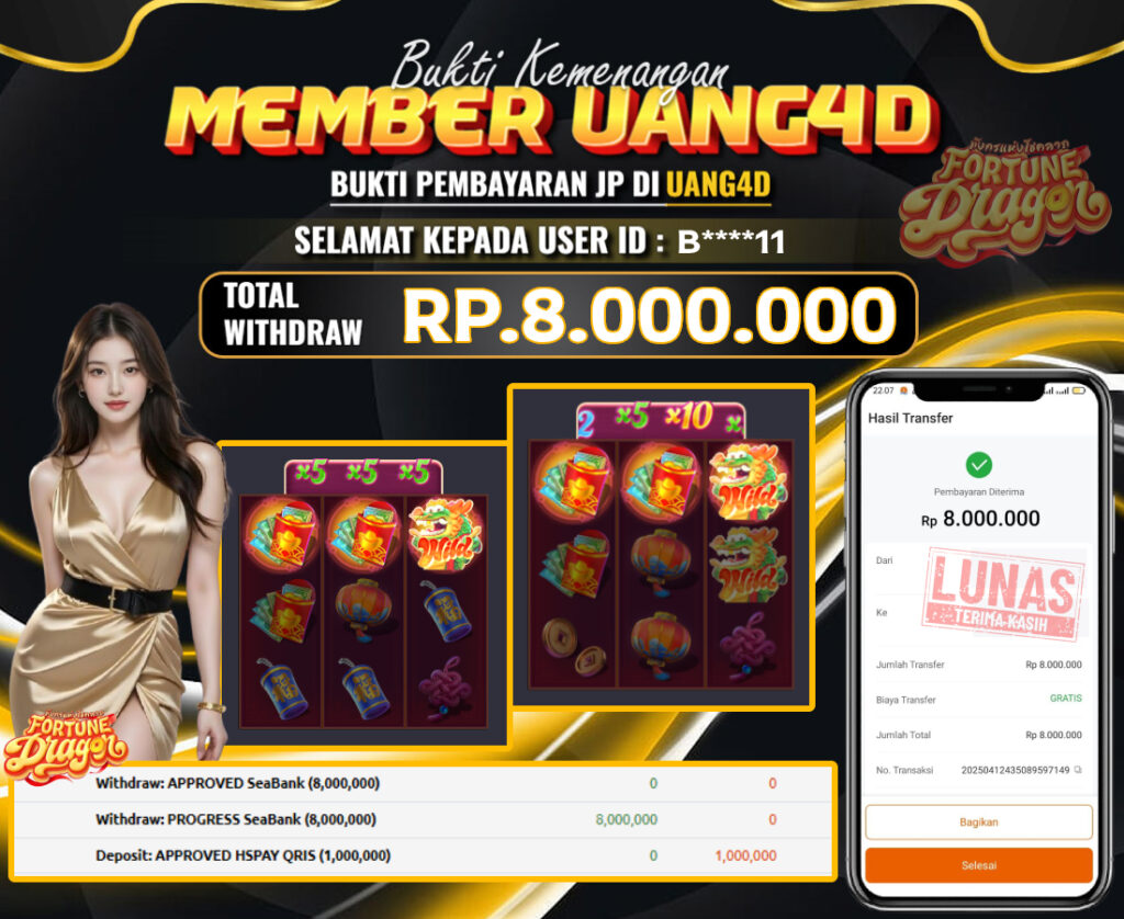 Jangan lewatkan kesempatan untuk meraih kemenangan besar. Daftar sekarang di UANG4D dan rasakan pengalaman bermain slot terbaik yang pernah ada! Putar gulungan, menangkan jackpot, dan jadilah bagian dari komunitas pemain sukses kami!