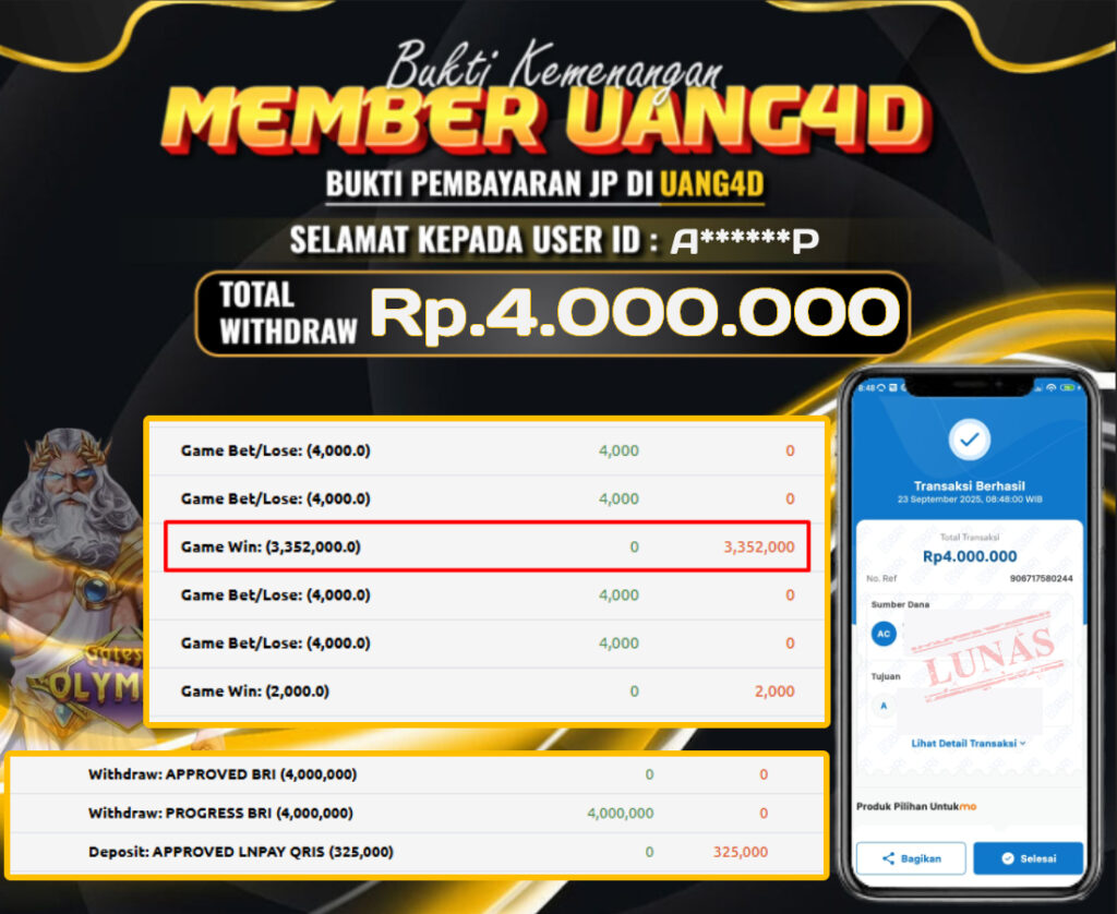 UANG4D JACKPOT SLOT Gates of Olympus 23 SEPTEMBER 2025, Kemenangan Slot, Bukti Kemenangan Slot, Kemenangan Slot Pragmatic Play, Menang Slot online, Slot Gacor, Situs Aman Terpercaya, Withdraw Berapapun Pasti DI Bayar Tuntas, Maxwin Slot Online.