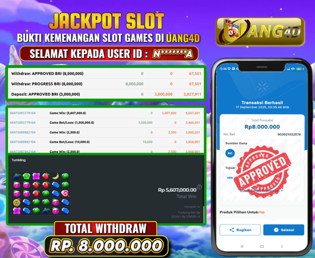 Jangan lewatkan kesempatan untuk meraih kemenangan besar. Daftar sekarang di UANG4D dan rasakan pengalaman bermain slot terbaik yang pernah ada! Putar gulungan, menangkan jackpot, dan jadilah bagian dari komunitas pemain sukses kami!