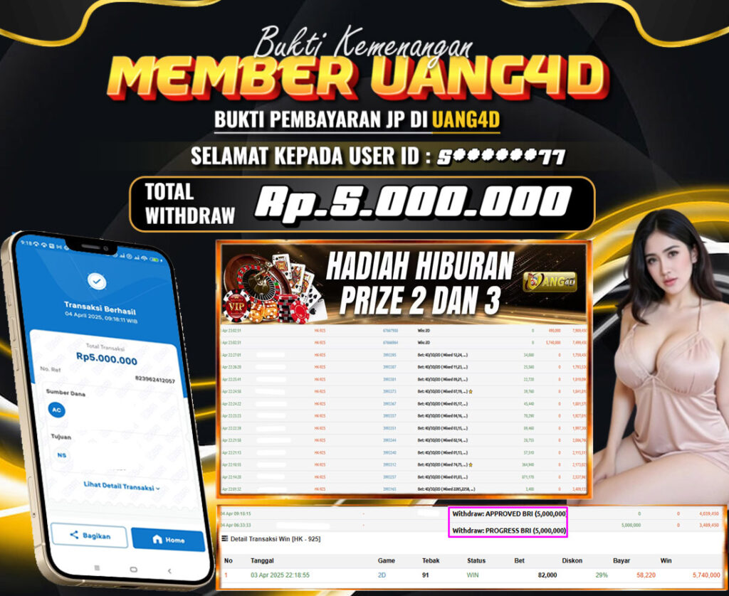 UANG4D dikenal sebagai situs terpercaya yang selalu menghadirkan pengalaman bermain slot online yang aman, fair, dan berlisensi resmi. Di sini, kami tidak hanya sekadar memberikan janji, tapi bukti nyata berupa slip kemenangan yang dapat Anda lihat secara langsung.