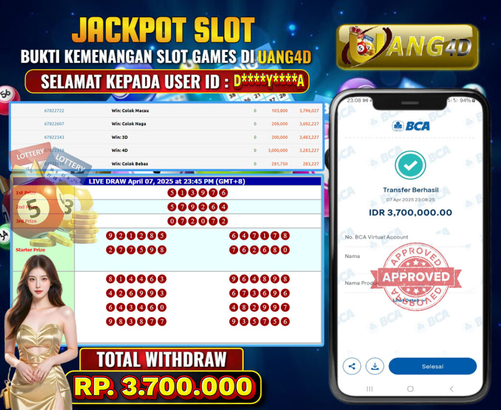 UANG4D dikenal sebagai situs terpercaya yang selalu menghadirkan pengalaman bermain slot online yang aman, fair, dan berlisensi resmi. Di sini, kami tidak hanya sekadar memberikan janji, tapi bukti nyata berupa slip kemenangan yang dapat Anda lihat secara langsung.