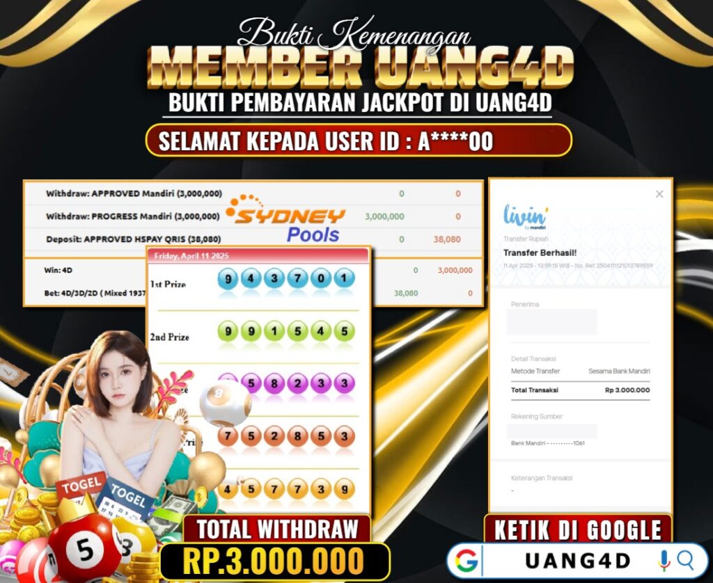 Setiap hari, member UANG4D berhasil meraih jackpot besar dari berbagai provider togel ternama yang kami sediakan, seperti Sydney, Singapore, Hongkong dan masih banyak lagi. Kami secara rutin menampilkan bukti screenshot atau rekapan kemenangan yang berhasil diraih, mulai dari kemenangan ratusan ribu hingga puluhan juta rupiah. Semua slip kemenangan ini kami hadirkan untuk membuktikan bahwa di UANG4D, peluang menang itu nyata.