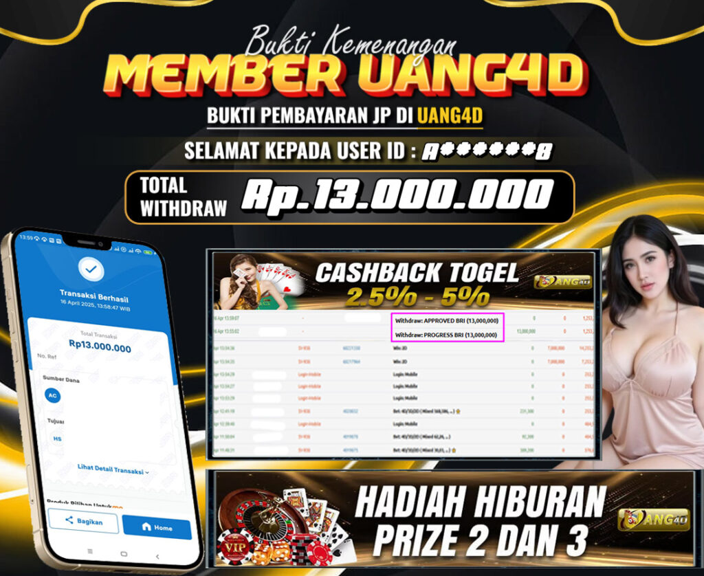 Setiap hari, member UANG4D berhasil meraih jackpot besar dari berbagai provider togel ternama yang kami sediakan, seperti Sydney, Singapore, Hongkong dan masih banyak lagi. Kami secara rutin menampilkan bukti screenshot atau rekapan kemenangan yang berhasil diraih, mulai dari kemenangan ratusan ribu hingga puluhan juta rupiah. Semua slip kemenangan ini kami hadirkan untuk membuktikan bahwa di UANG4D, peluang menang itu nyata.