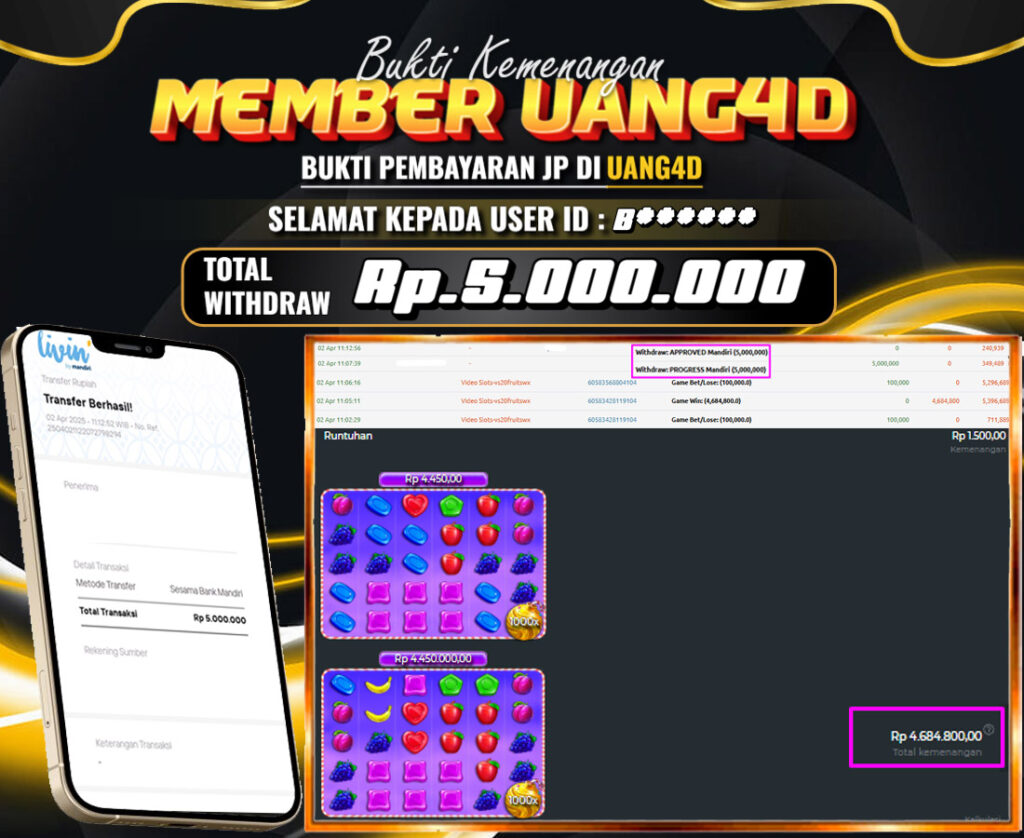 Jangan lewatkan kesempatan untuk meraih kemenangan besar. Daftar sekarang di UANG4D dan rasakan pengalaman bermain slot terbaik yang pernah ada! Putar gulungan, menangkan jackpot, dan jadilah bagian dari komunitas pemain sukses kami!